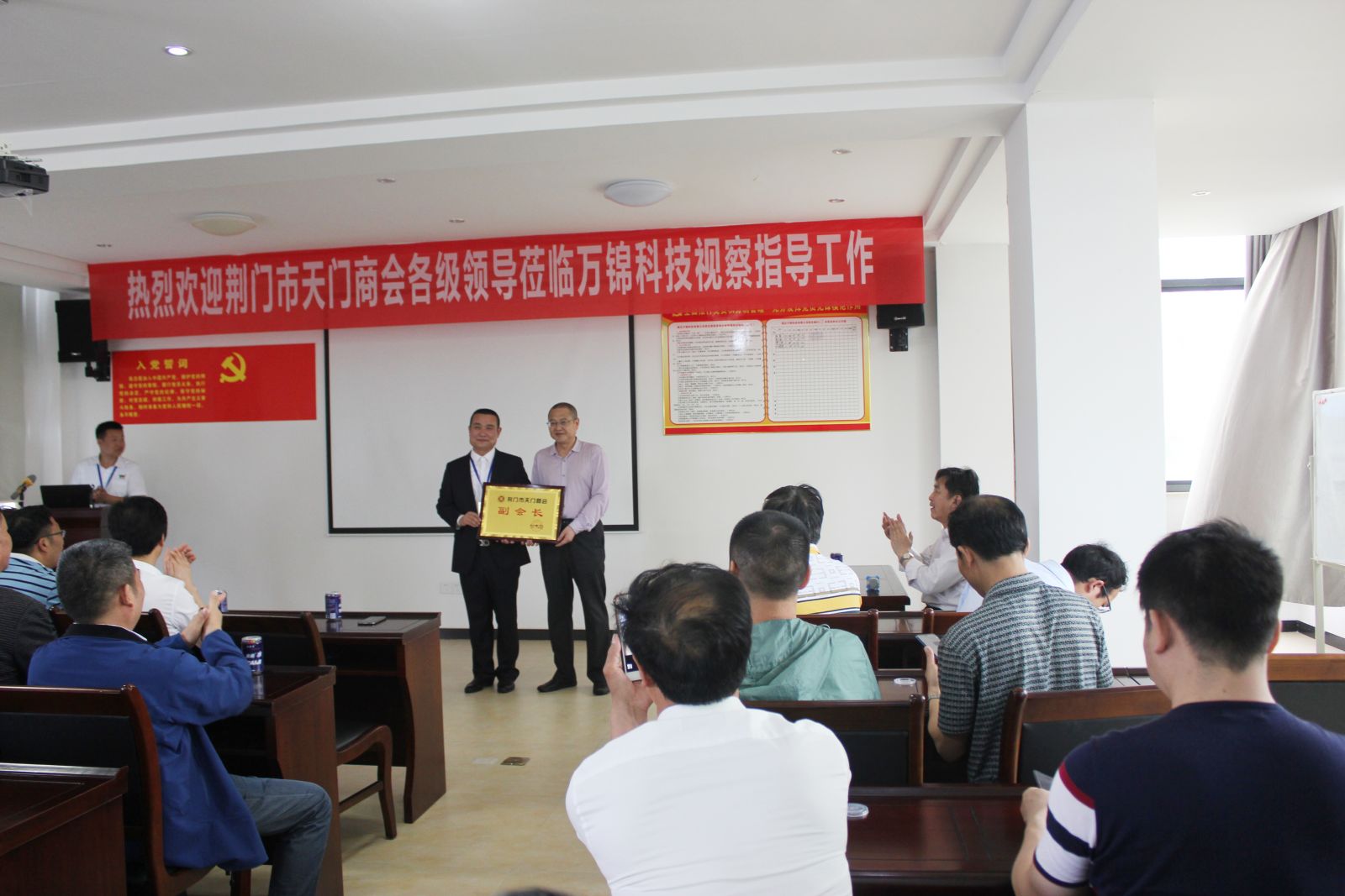 荊門市天商聯(lián)合會(huì)會(huì)長馬懷義向萬錦科技董事長夏祥義同志頒發(fā)了荊門市天商聯(lián)合會(huì)副會(huì)長牌匾。