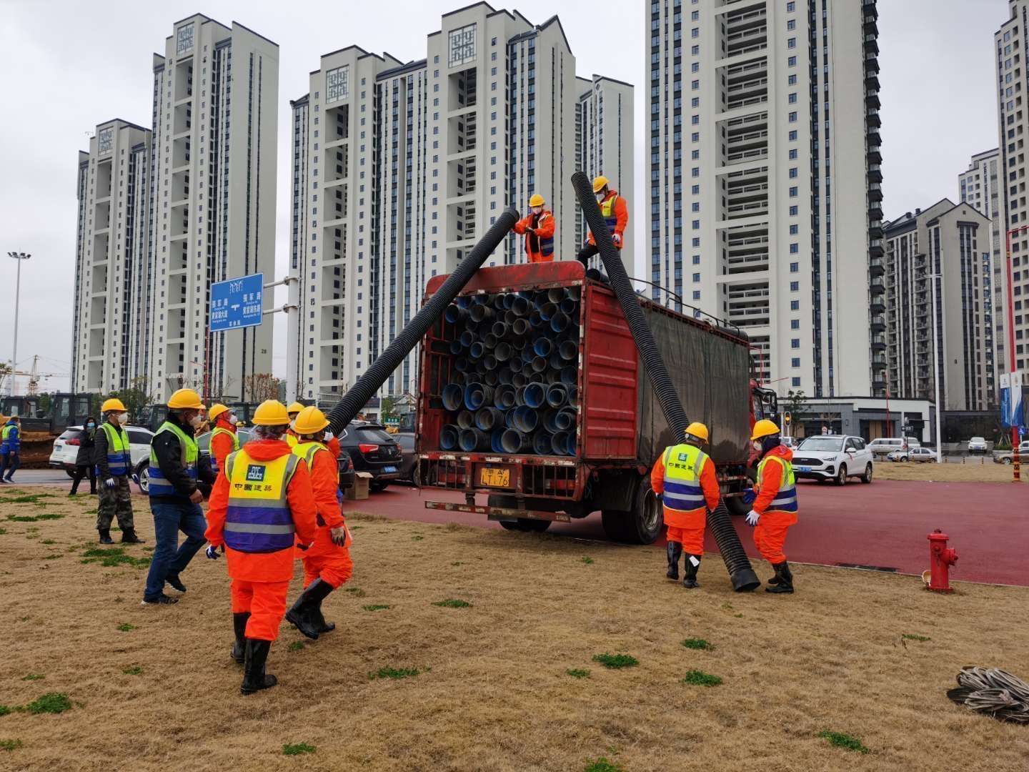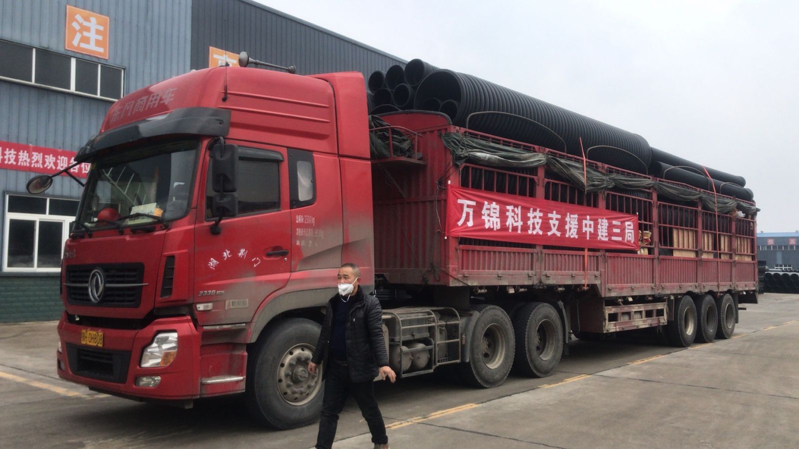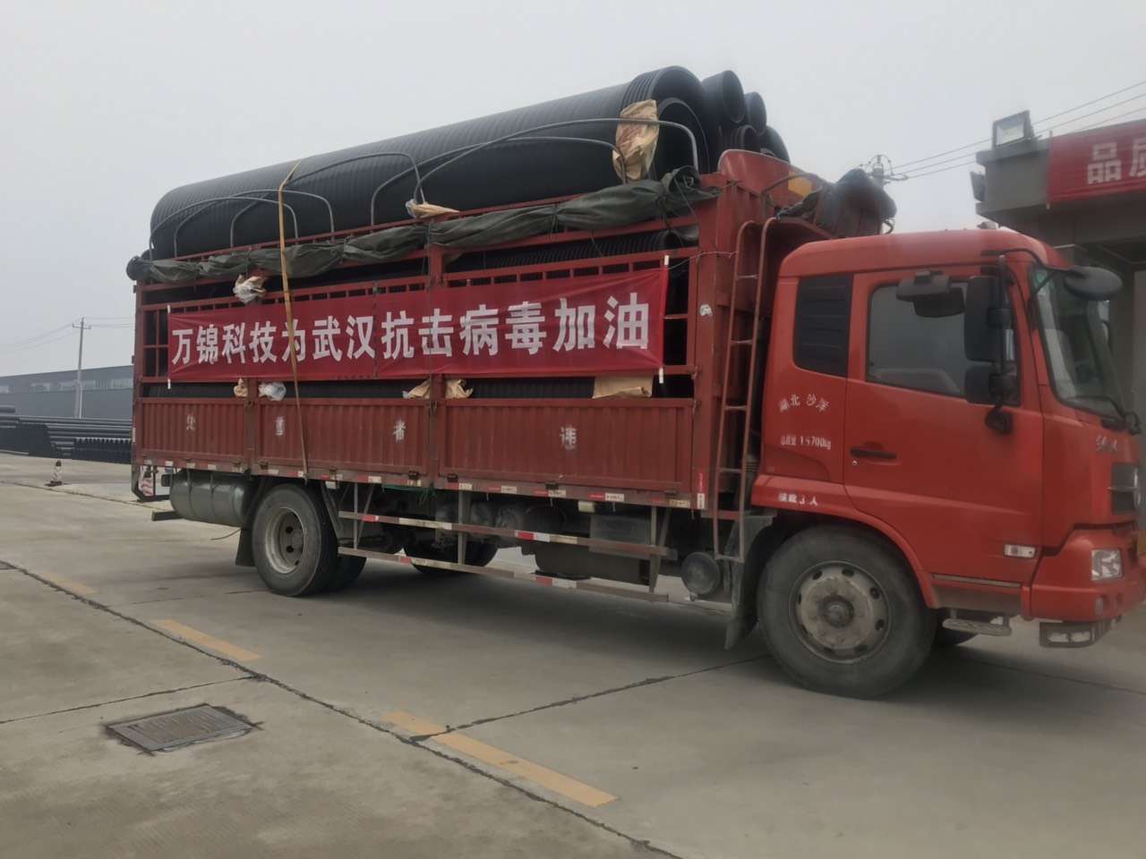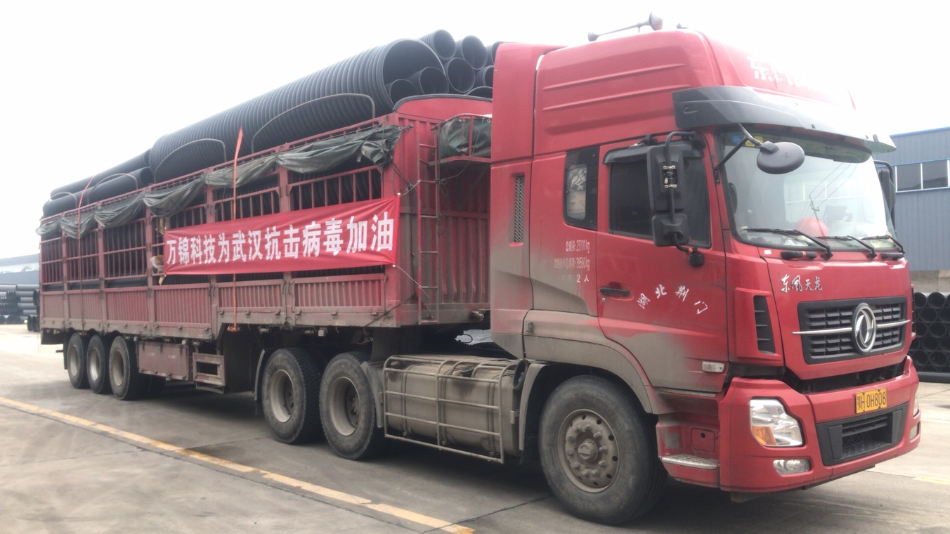 湖北萬錦科技有限公司于2020年1月24日(大年三十)下午接到中建三局、漢陽市政兩個(gè)合作單位為武漢市蔡甸區(qū)火神山醫(yī)院建設(shè)的緊急材料支援要求后,萬錦科技及時(shí)派人清點(diǎn)庫存并上進(jìn)行了上報(bào)。1月25日(正月初一)、26日(正月初二)連續(xù)兩天組織車輛和裝卸人員為火神山醫(yī)院的建設(shè)提供大口徑管道3124米,總噸位440噸,大小掛車20輛。1月28日上午,應(yīng)中建三局武漢市江夏區(qū)雷神山醫(yī)院建設(shè)項(xiàng)目指揮部的要求,又組織裝運(yùn)到雷神山醫(yī)院建設(shè)現(xiàn)場(chǎng)各類管道1800米,總噸位186噸,大小掛車6輛。同時(shí),萬錦科技為火神山醫(yī)院無償捐獻(xiàn)5萬元的管道一車。