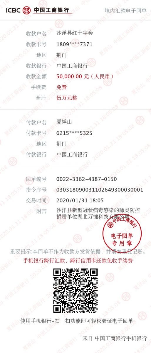 2020年1月31日,萬錦科技向沙洋縣紅十字會(huì)捐贈(zèng)專項(xiàng)沙洋縣新型冠狀病毒感染防控資金5萬元人民幣。