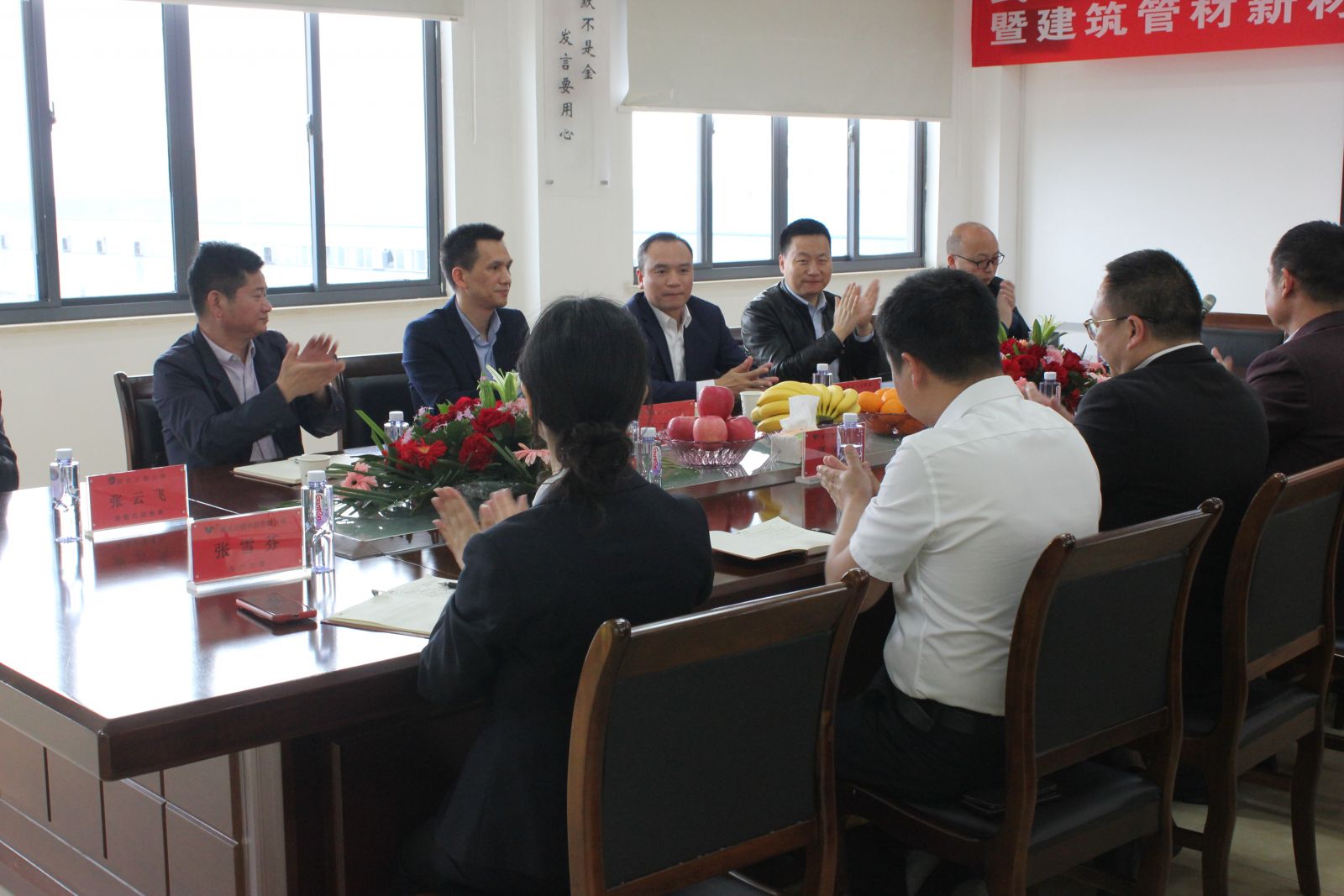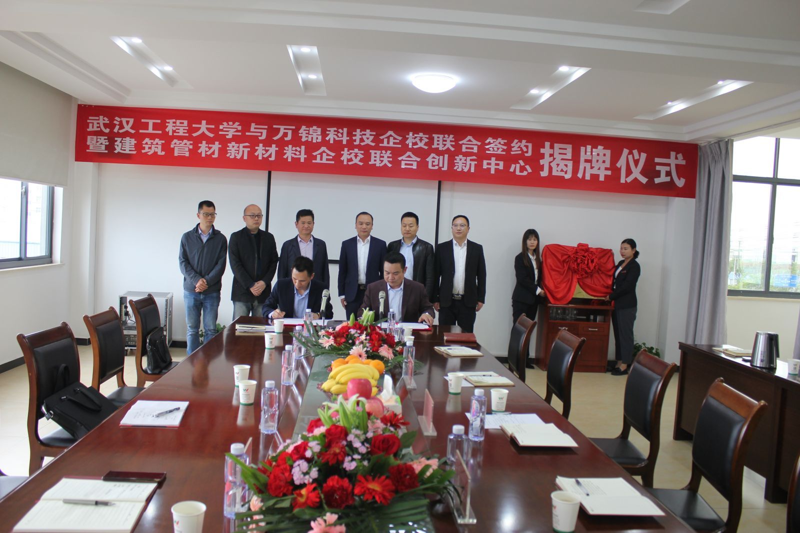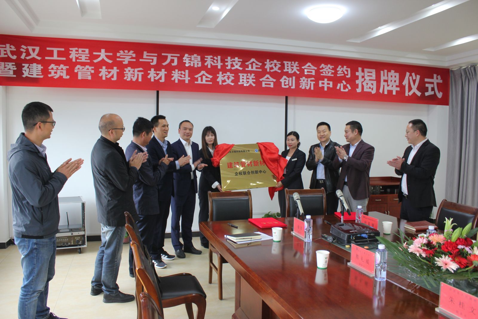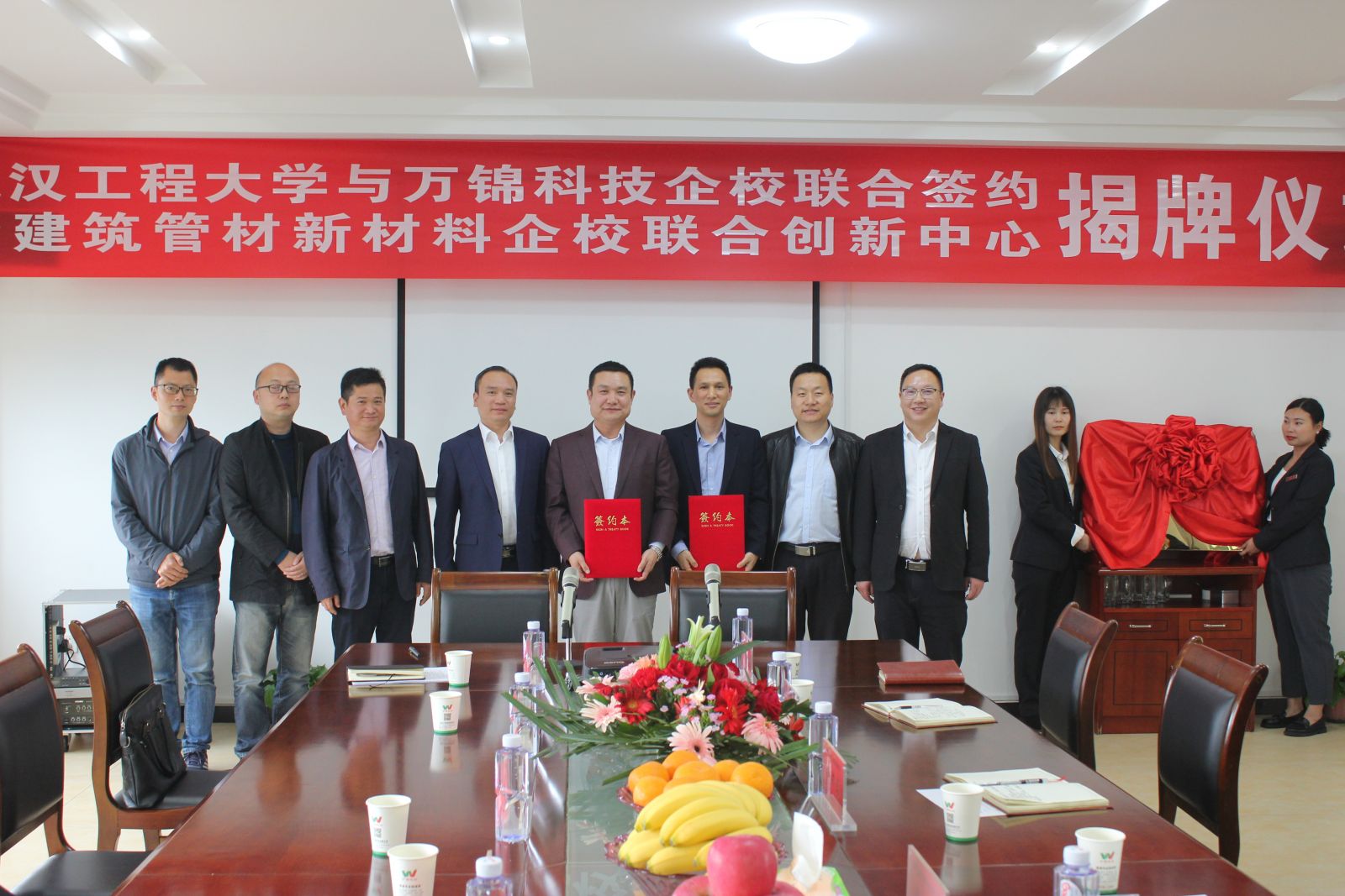 4月28日,湖北萬錦科技有限公司與武漢工程大學(xué)企校合作簽約暨建筑管材新材料企校聯(lián)合創(chuàng)新中心揭牌儀式在我司隆重舉行。武漢工程大學(xué)材料學(xué)院副院長熊禮威 、教授杜飛鵬、老師張云飛;沙洋縣人民政府副縣長朱桂文、沙洋縣科經(jīng)局黨委書記肖華峰、沙洋縣科經(jīng)局副局長徐軍;公司相關(guān)部門負(fù)責(zé)人出席簽約及揭牌儀式。