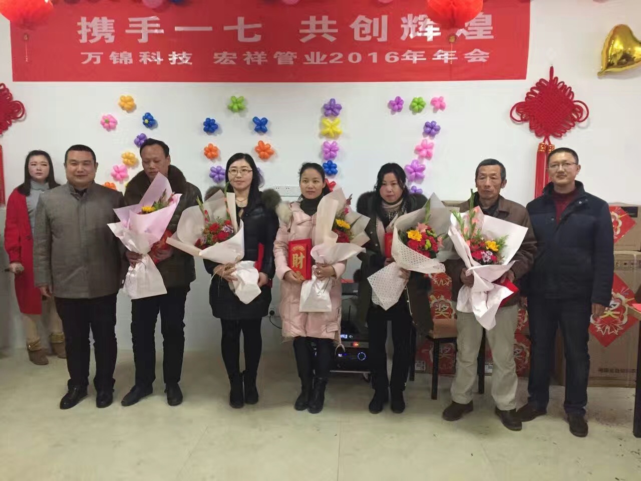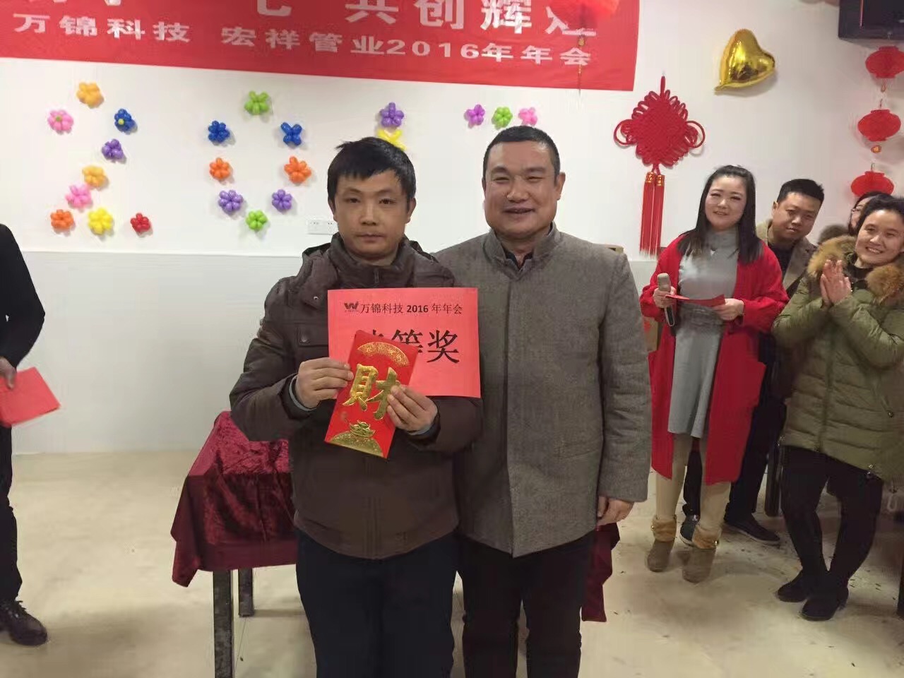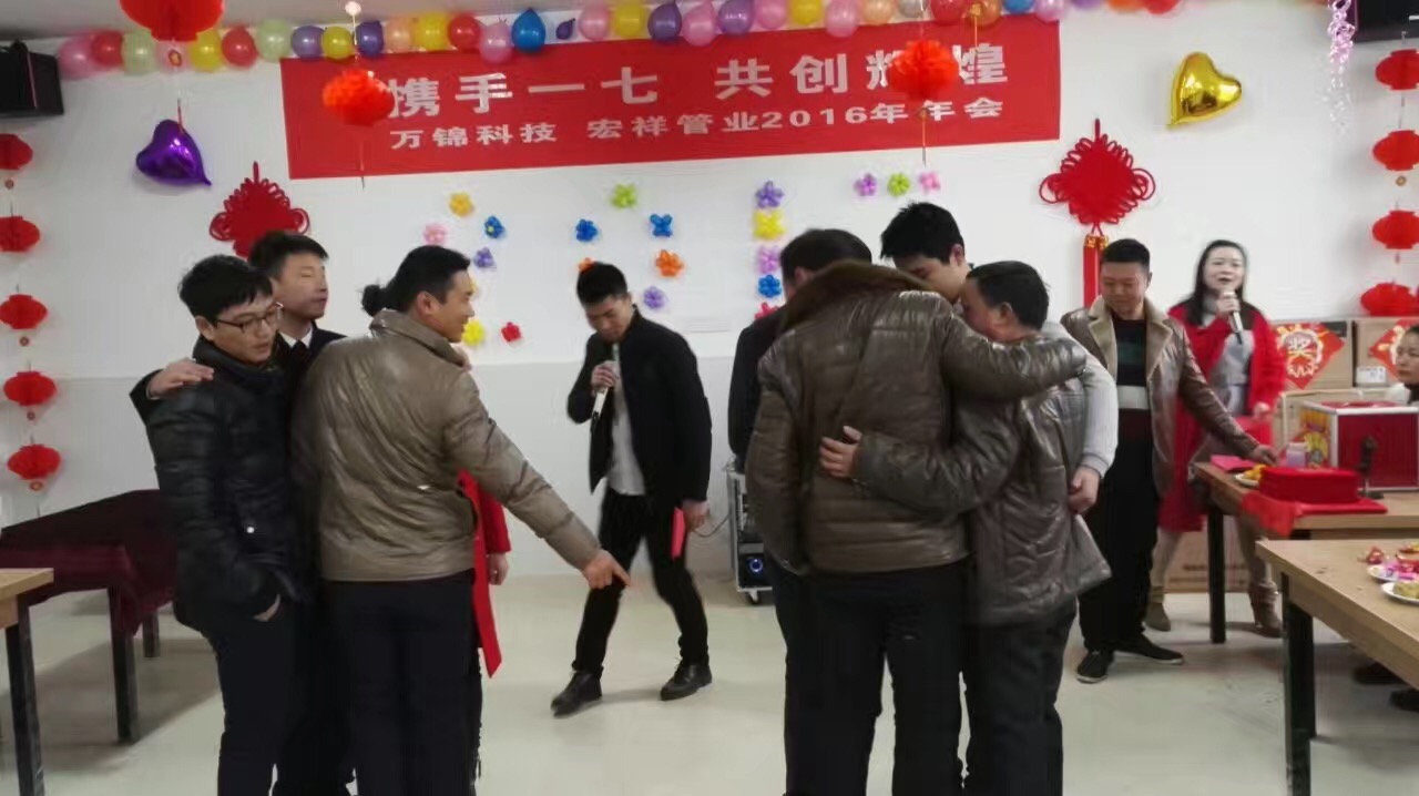 2017年1月18日,萬錦科技舉辦了“攜手一七 共創(chuàng)輝”2016年聯(lián)歡晚會,晚會開始前,兩位主持人組織到場人員進行了各項小游戲,并對優(yōu)勝者頒發(fā)了歡樂獎;晚會第二項由公司副總經(jīng)理、財務總監(jiān)饒林香女士宣布了2016年度生產(chǎn)標兵和優(yōu)秀員工,集團副總吳國安先生為生產(chǎn)標兵的優(yōu)秀員工頒發(fā)了榮譽證書,集團董事長夏祥義先生為生產(chǎn)標兵和優(yōu)秀員工頒發(fā)了現(xiàn)金紅包獎;晚會第三項進行了部門精英挑戰(zhàn)賽,依次由副總經(jīng)理、財務總監(jiān)饒林香女士;副總經(jīng)理、生產(chǎn)總監(jiān)張艷平;宏祥管業(yè)生產(chǎn)總監(jiān)陶建明;營銷總監(jiān)高陽新代表四個部門進行2017年工作任務表態(tài)發(fā)言;晚會第四項集團董事長夏祥義先生致辭;晚會第五項進行了幸運大抽獎,抽取了特等獎1名,獎品為現(xiàn)金2888元;1等獎2名,獎品為現(xiàn)金1888元;2等獎3名,獎品為小天鵝洗衣機1臺;3等獎10名,獎品為美的微波爐1臺;晚會第六項年會晚宴,晚宴結束后對到場人員進行了新春禮品發(fā)放。