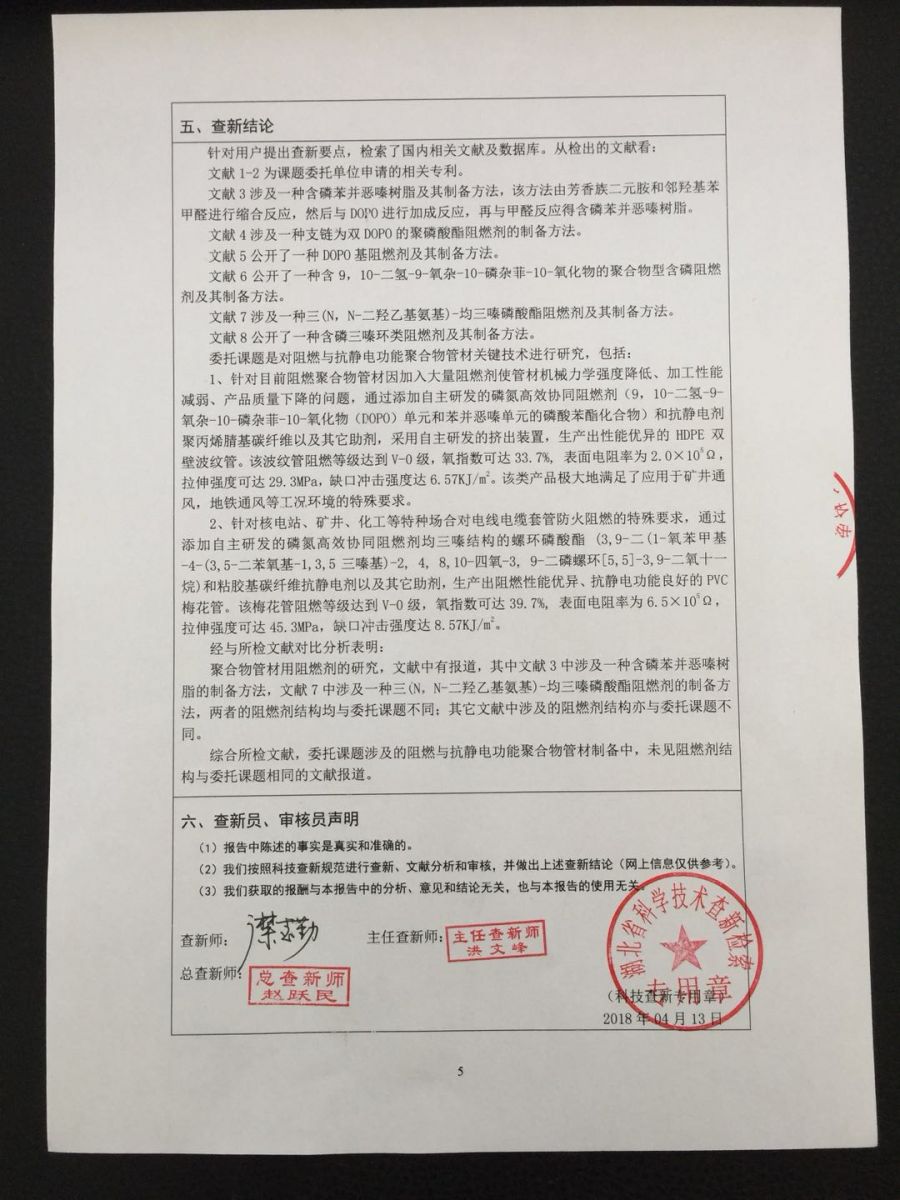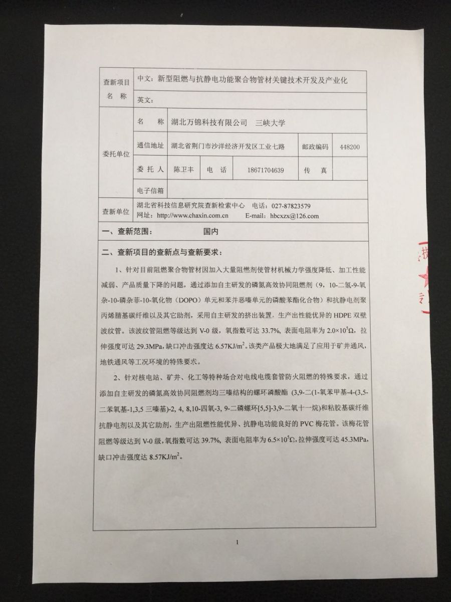 ?新型阻燃與抗靜電功能聚合物管材關(guān)鍵技術(shù)開發(fā)及產(chǎn)業(yè)化的查新報(bào)告!